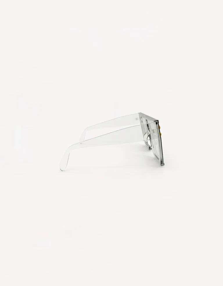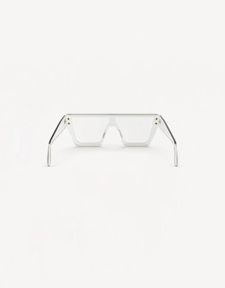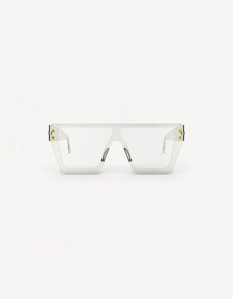 These futuristic shield sunglasses combine a sleek, transparent design with a bold geometric frame. Featuring subtle star embellishments, they offer a modern edge to any outfit while maintaining lightweight comfort and eye protection for both casual and high-fashion looks.